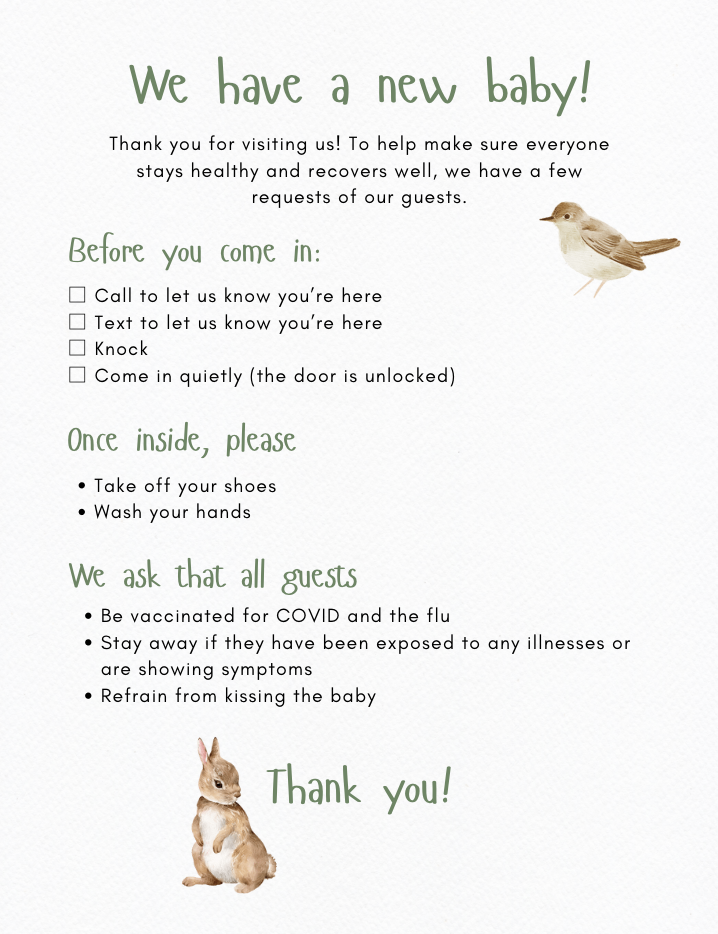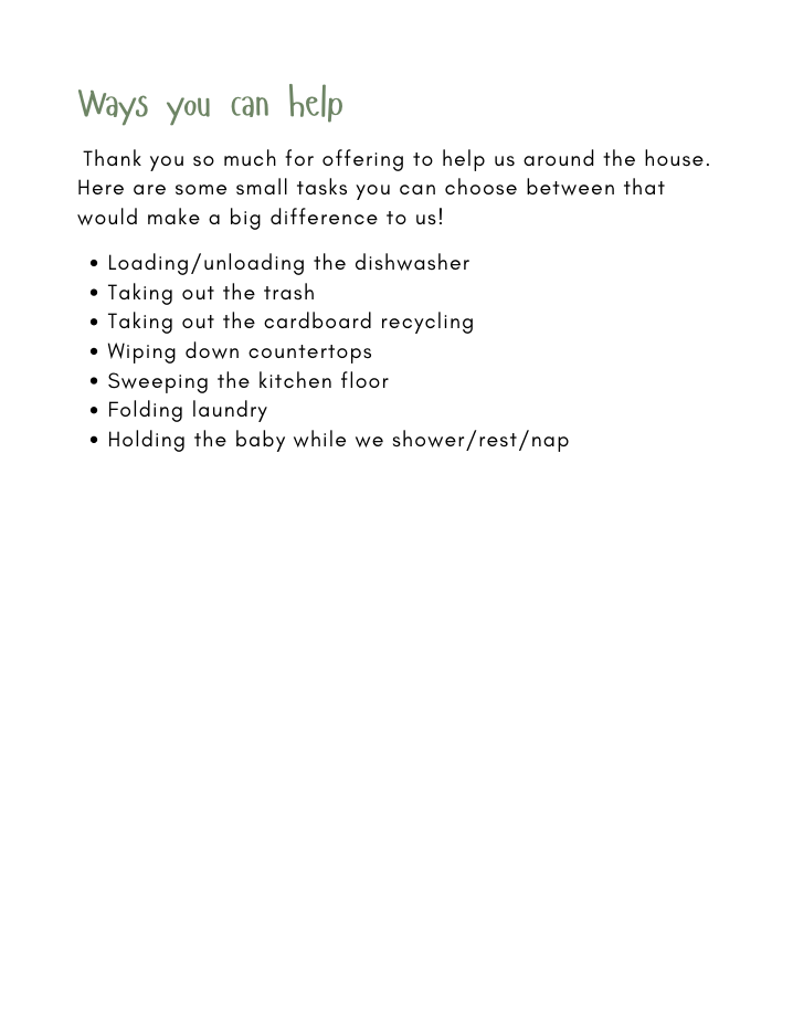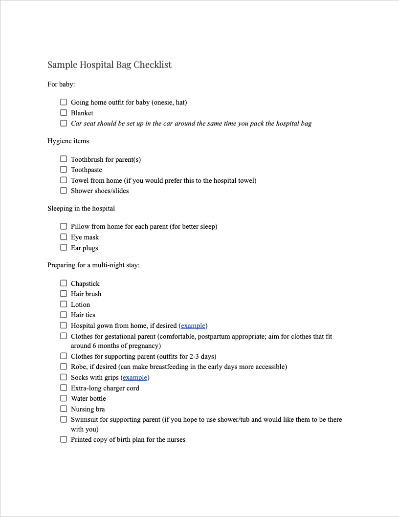 Pregnancy & postpartum downloads Sample Hospital Bag Checklist Select ‘File’ then ‘Make a copy’ to personalize Postpartum door sign Postpartum support menu For houseguests who offer to help